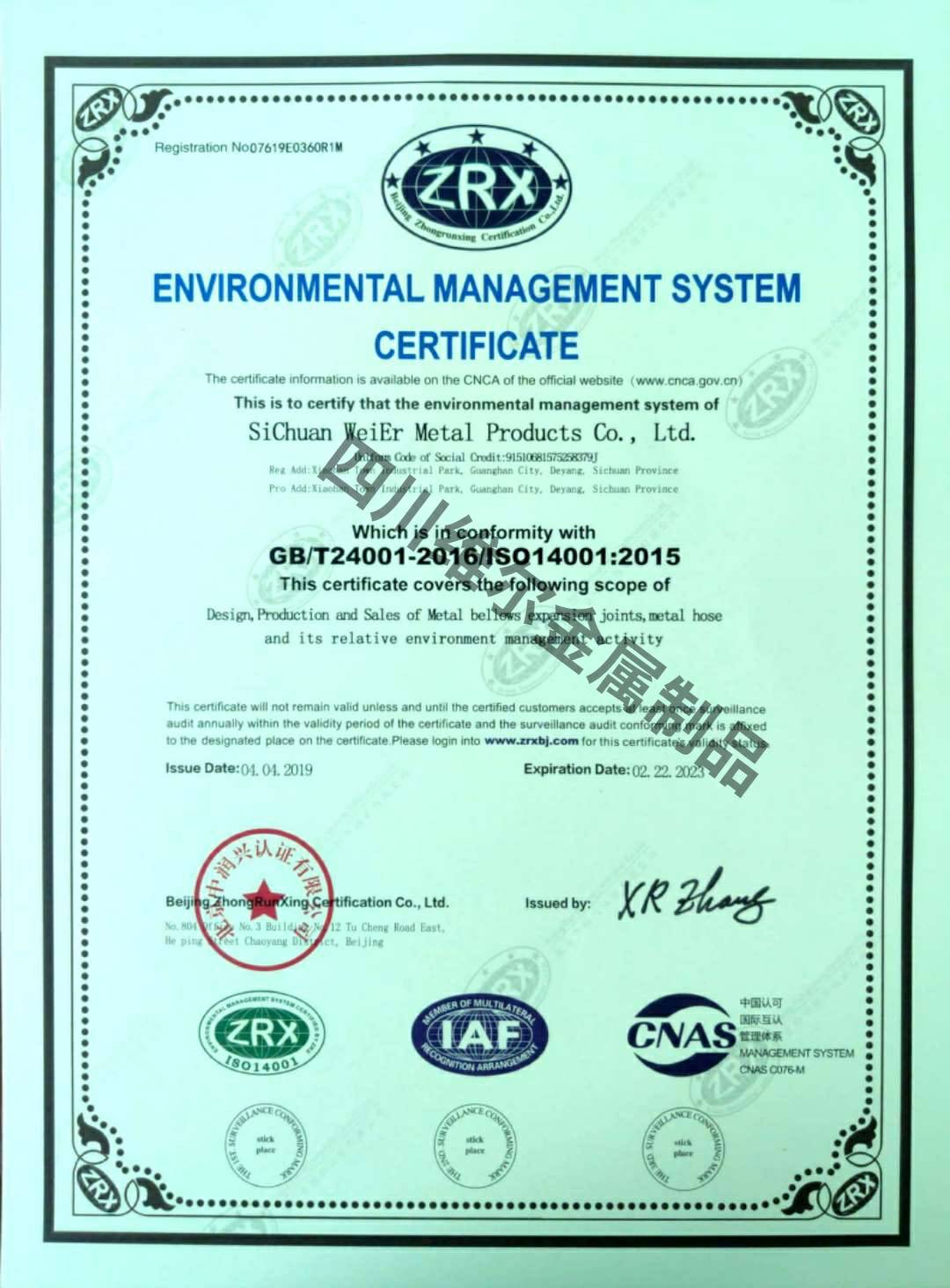 环境管理体系认证证书